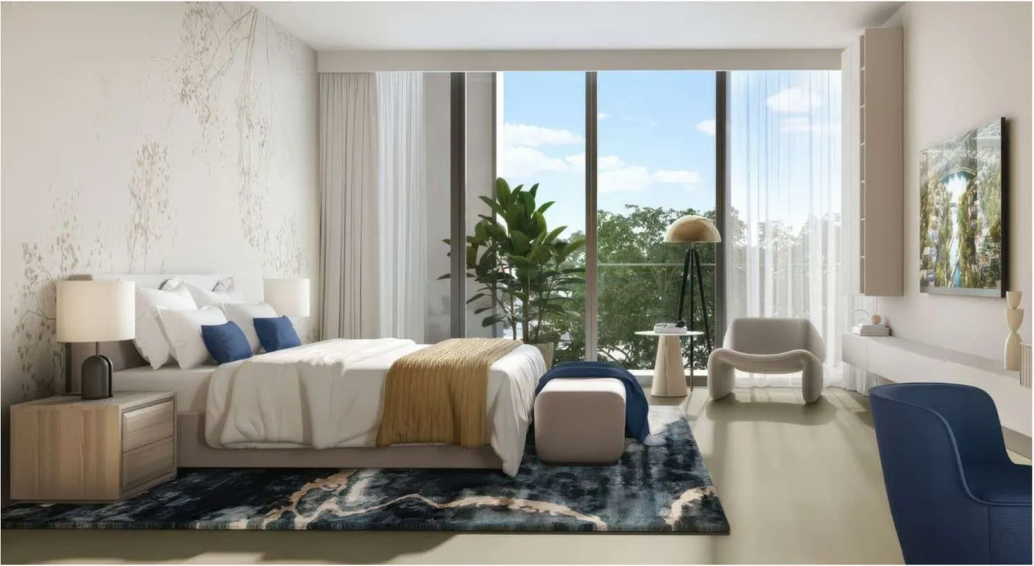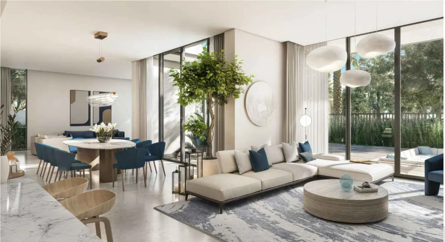 Designed for moments of relaxation and enjoying good friends’ company, the living space features two sitting rooms that flank an open formal dining room. A presentation kitchen with a breakfast bar adds to the space’s entertainment potential, with a heavy kitchen hidden discreetly behind it for seamless meal preparation. The bedroom suites are generously sized, inviting brightness and natural calm via floor-to-ceiling windows.