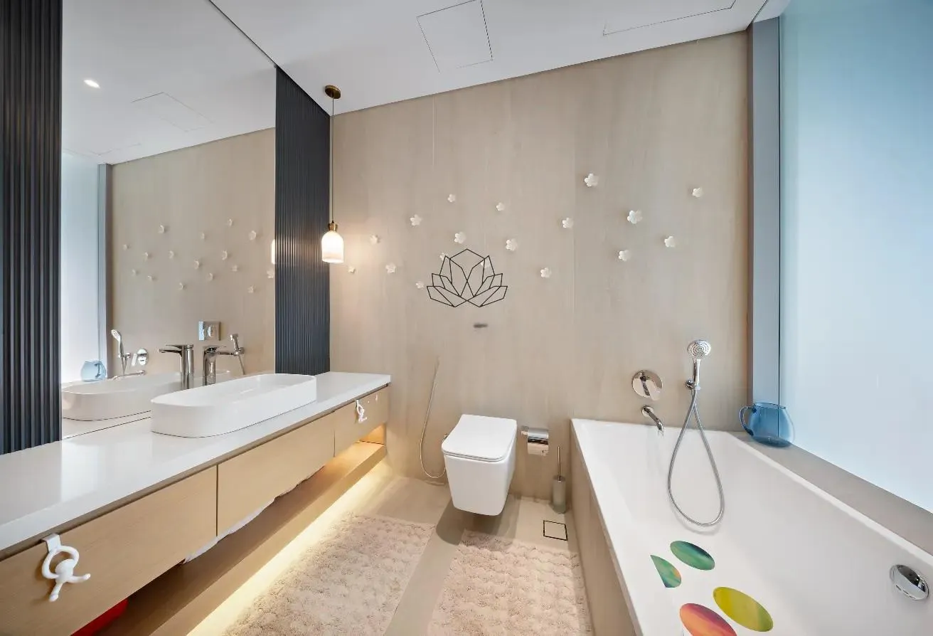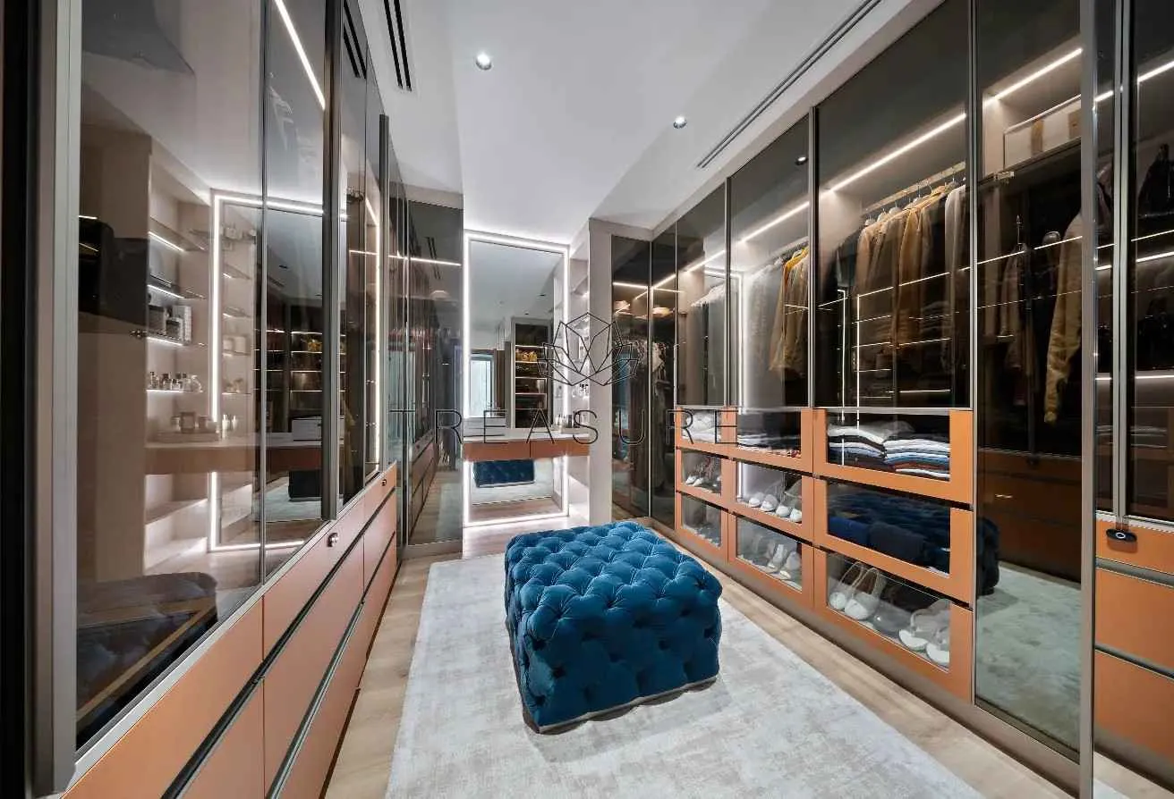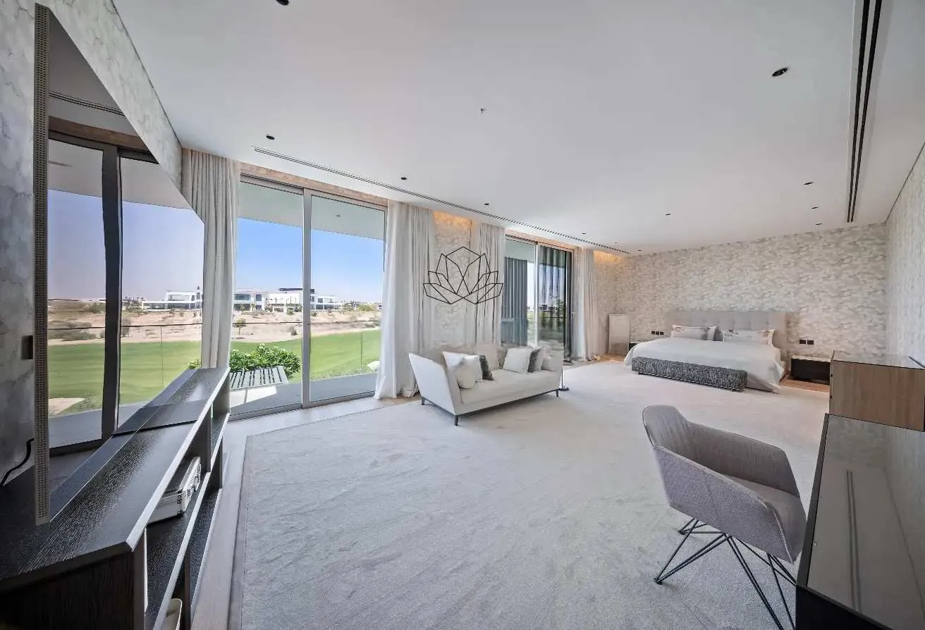 Expansive interiors unfold seamlessly, where handcrafted walk-in wardrobes, soaring ceilings, and serene lounges create a narrative of effortless elegance. Full-height windows frame rolling fairways and crimson-hued sunsets, offering cinematic views from nearly every vantage point.